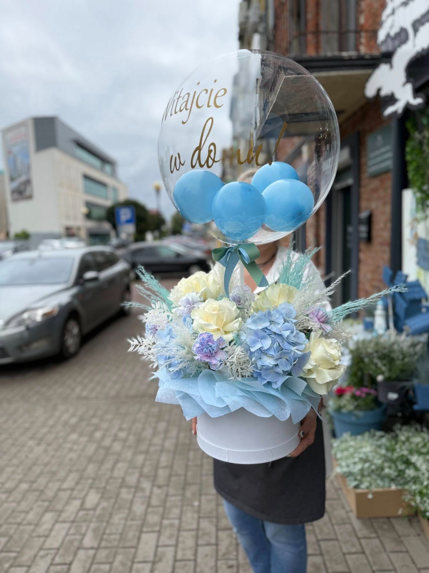 • Flowerbox z balonem "Witaj w domu"